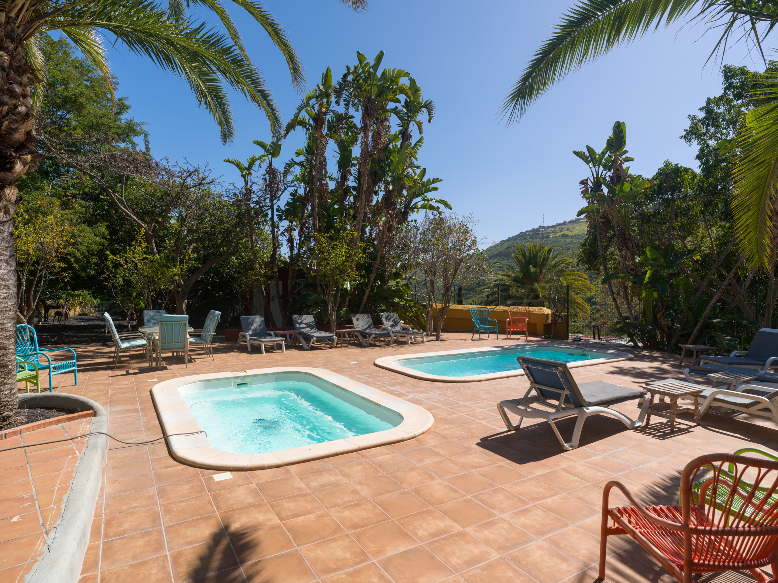L'extérieur offre un vaste terrain de 26000 mètres carrés avec des vues impressionnantes sur la montagne et des jardins, créant un environnement naturel et relaxant. Il dispose de places de parking privé en plein air, ce qui facilite le stationnement des véhicules de location ou personnels.